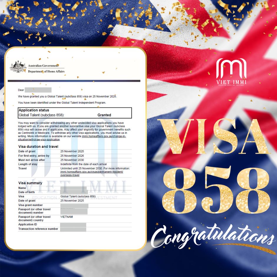 VIETIMMI xin chúc mừng khách hàng H.T.N đã chính thức được Chính phủ Úc cấp visa 858 – Global Talent vào ngày 25/11/2025. Đây là một trong những visa danh giá nhất của hệ thống di trú Úc, dành cho những cá nhân có thành tích nổi bật và đóng góp giá trị trong lĩnh vực chuyên môn của mình.